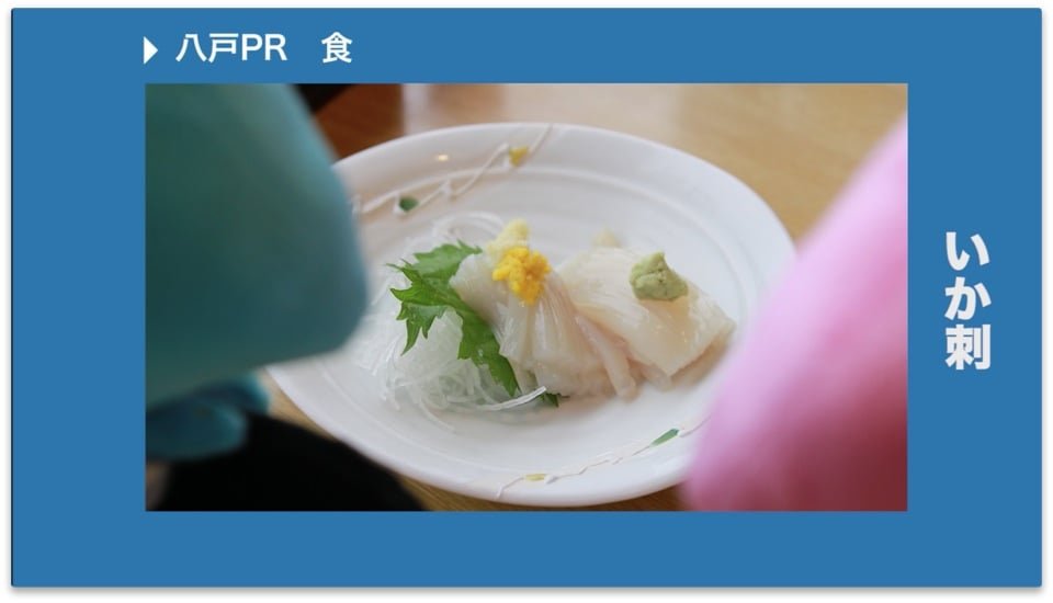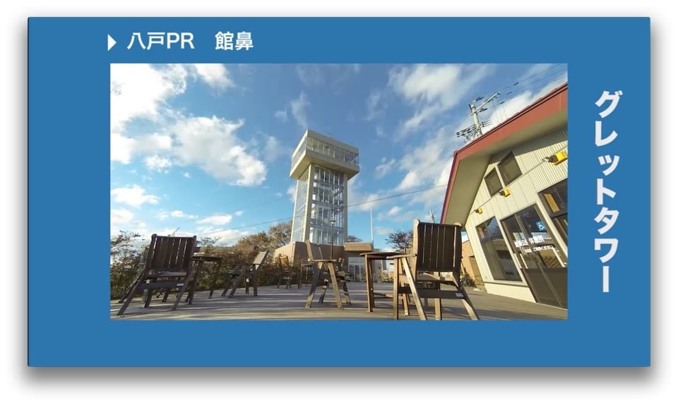 花火が打ち上がっていない間に、前撮りした映像を随所に挿入しました。おもに八戸のPRを目的としたもので、種差海岸や蕪島、館鼻漁港、八戸ポータルミュージアム、八戸の特産品などが含まれています。